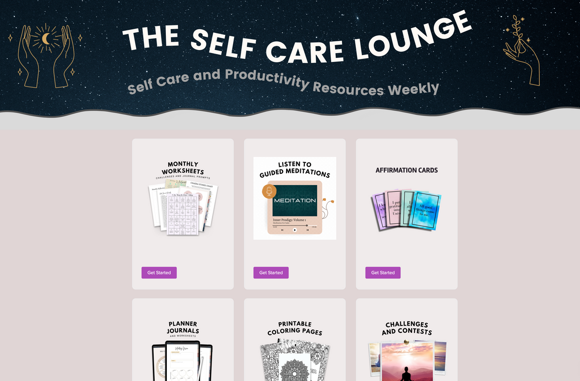 In the self care lounge, each month you will have access to meditations sessions, calming music, journal prompts, affirmations, productivity tips, worksheets, guides and challenges.